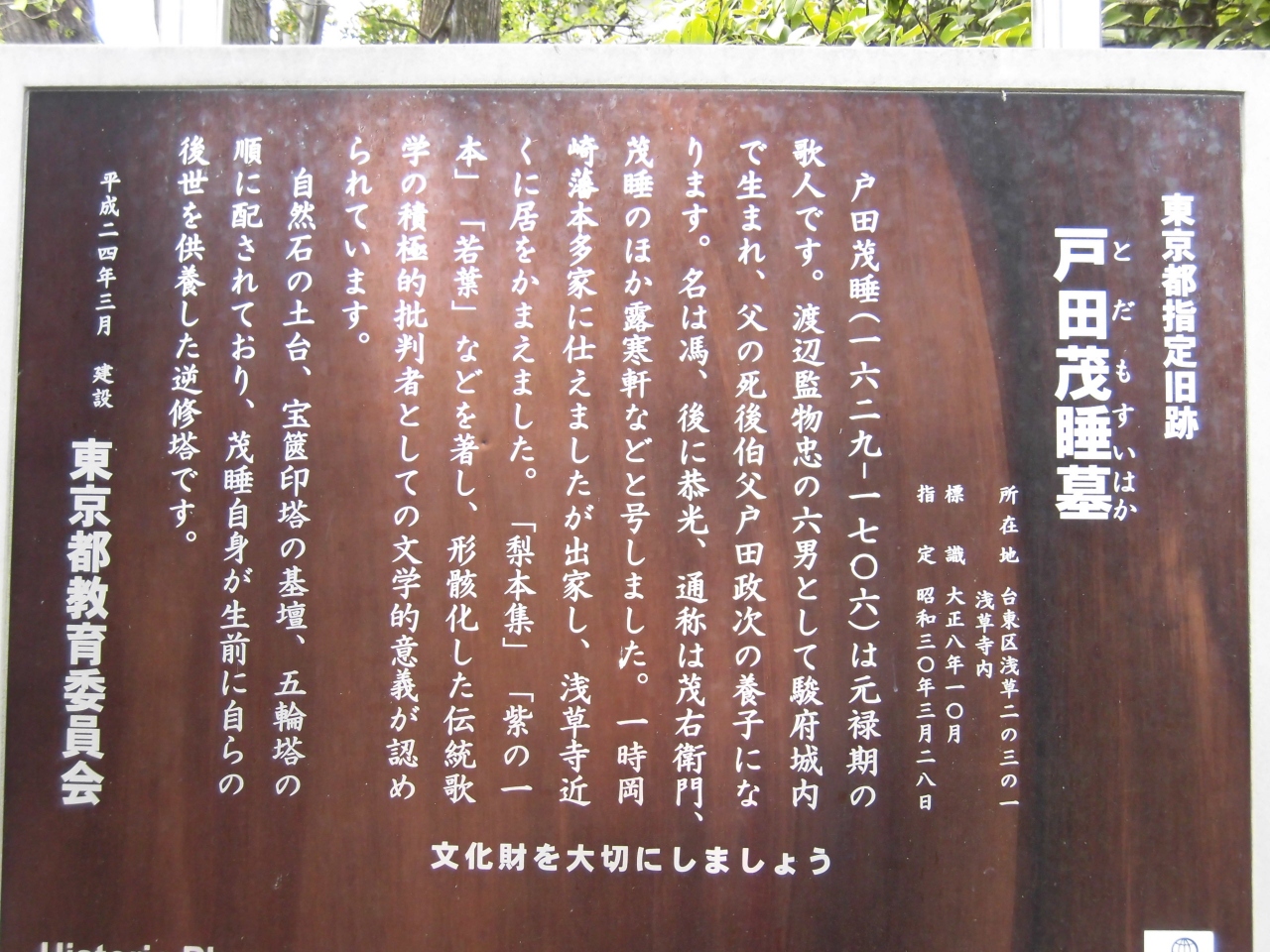 浅草寺の新奥山の敷地内にあります。この方は、出家し浅草寺近くに居を構え、形骸化した伝統歌学への積極的批判者として知られています。墓石は茂睡自身が生前に自らの後世を供養した逆修塔で、自然石の土台、宝篋印塔の基壇、五輪塔の順にのせられています。調和の取れた美しいお墓です。