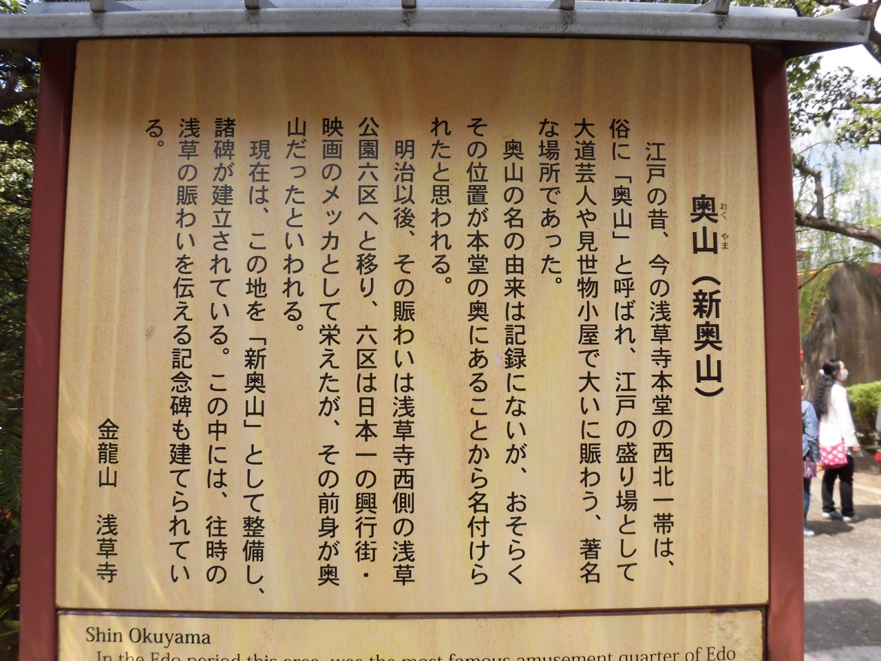 浅草寺が込み合っているのに、同じ敷地内にある新奥山は静かな落ち着いた場所です。この敷地内にはいろいろな石碑(力石、瓜生岩子像、戸田茂睡墓、その他)などがあり、大変興味深いところです。説明版を読んで回るだけでも勉強になりました。