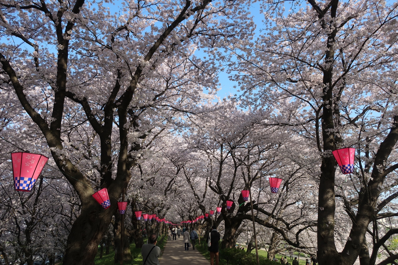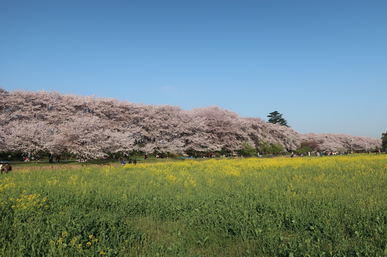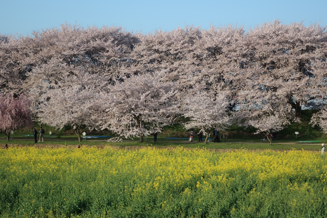 堤防には1kmほどの桜並木が植えられていますが、他の所よりも木の間隔が狭く密集度が高いため横から見るとピンクの畝が続いて居る様に見えます。さらに河川敷には菜の花が植えられており、菜の花と桜の花の共演が見られる所が最大の魅力。今年は桜の花が早く咲きすぎ、菜の花は5分咲き程だったのが残念ですが、見事な桜並木が見られる景観地です。