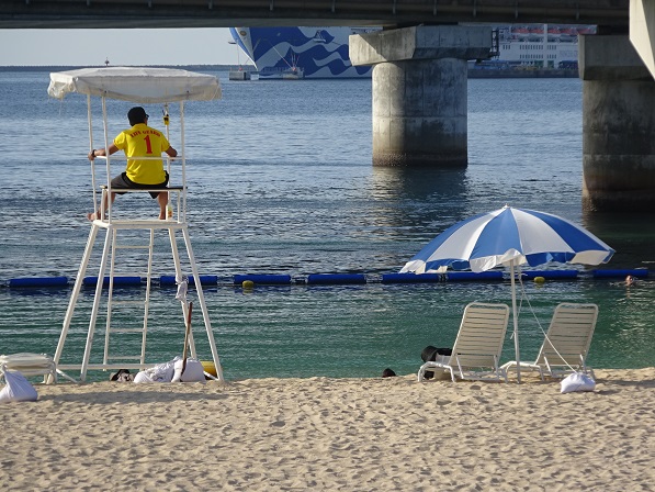 宿泊先の旭橋にあるホテルから歩いて10分ぐらい。那覇中心地であることと目の前に橋がかかっているので決して景観はよくないですが、気軽に行けるビーチでしょうか。4月9日、海開きしていて泳いでいる人が結構いました(*^^*)。ほとんどアジア系の外国人でしたが。海水はきれいです。人口ビーチなのですね。