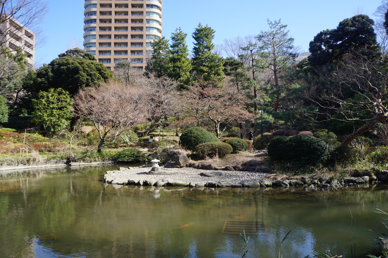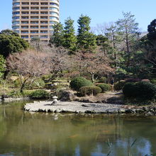 園内には湧水があって、潤いが豊か。周囲の高層ビルが目に入らないことはないですが、十分な優雅さがあると思います。