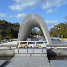 公園内の慰霊碑に黙祷します。原爆投下時、多くの被爆者が水を求めたそうですが、ここでも水がシンボリックに使われています。
