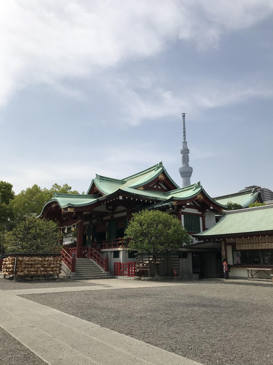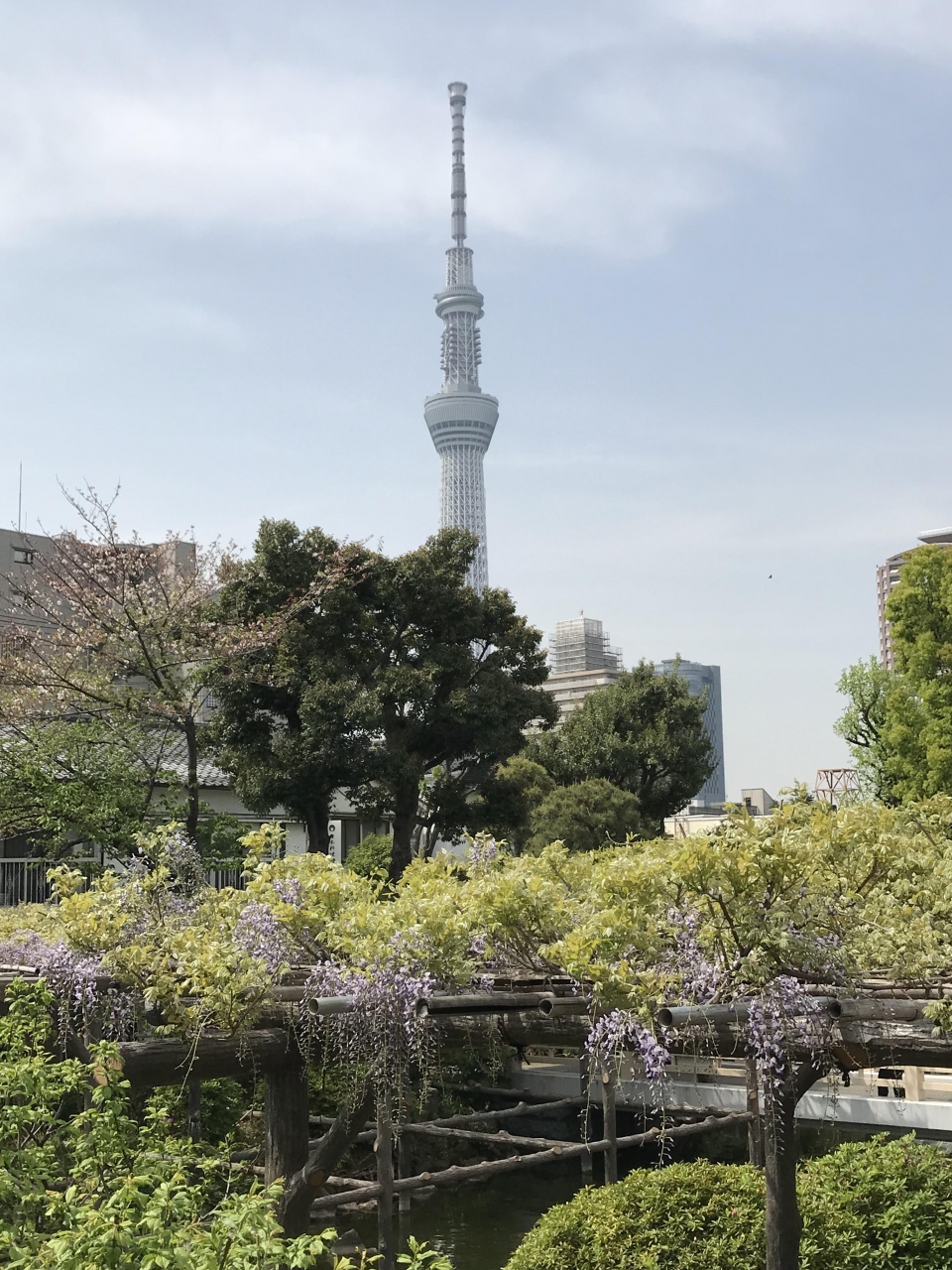 東京スカイツリーが藤棚の向こうにそびえ立ち、日本の風情と最新技術が同時に楽しめる、素敵な天神様です。