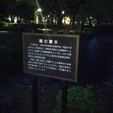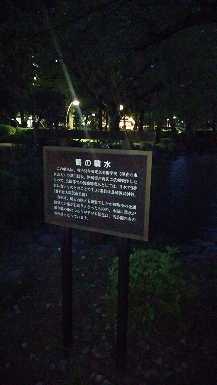 雲形池にある鶴の噴水です。あいにく、夜の時間だったからか、噴水から水は出ていませんでした。