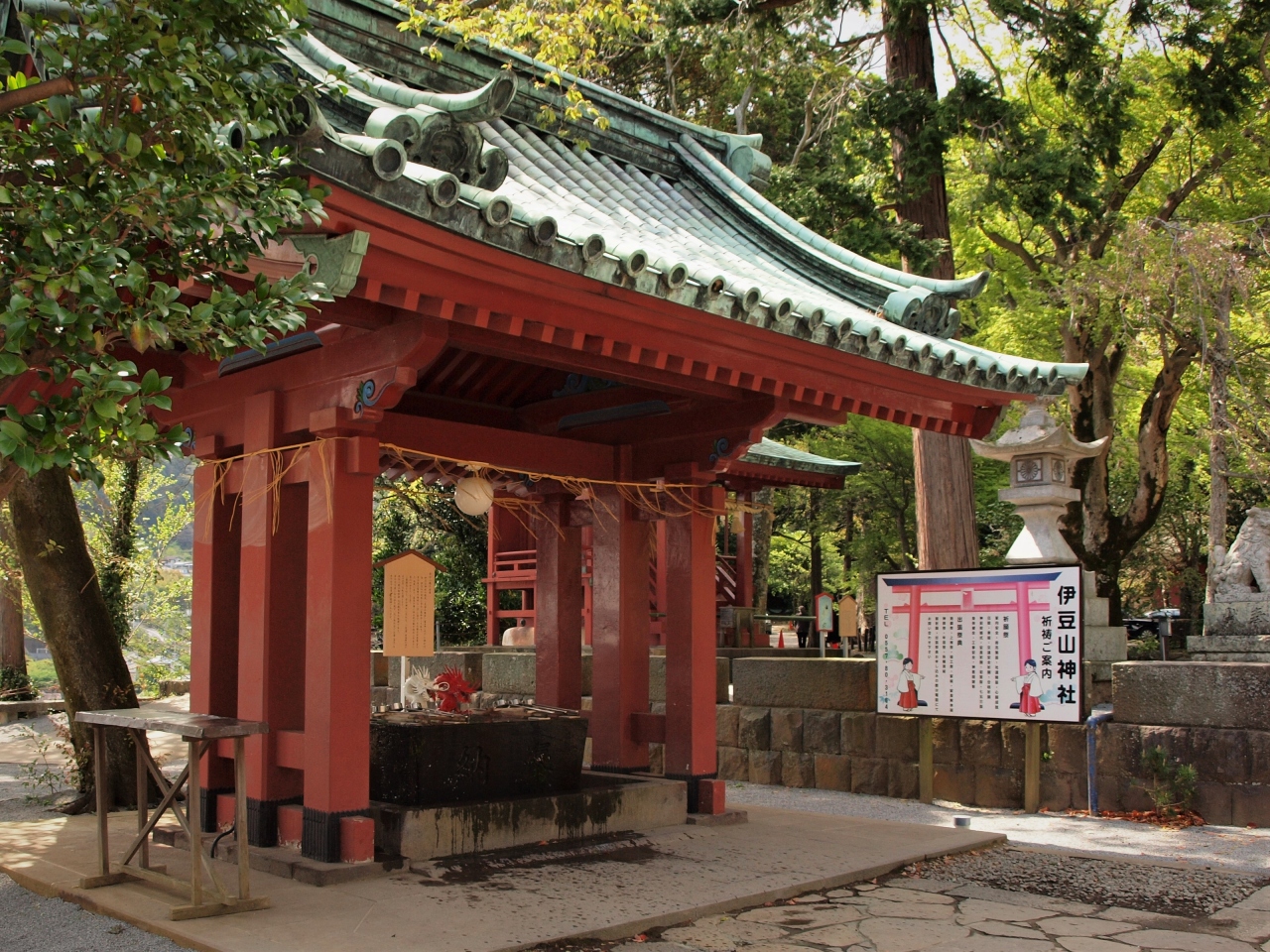 境内は歌枕に名高い伊豆の御山で、かつて上宮と呼ばれていました。山道の階段を下って海抜50メートル弱の地点には下宮の跡地があり、さらに伊豆浜に下ると走り湯があります。伊豆山、走湯山と呼び親しまれてきた強運守護、福徳和合、縁結びの神様です。