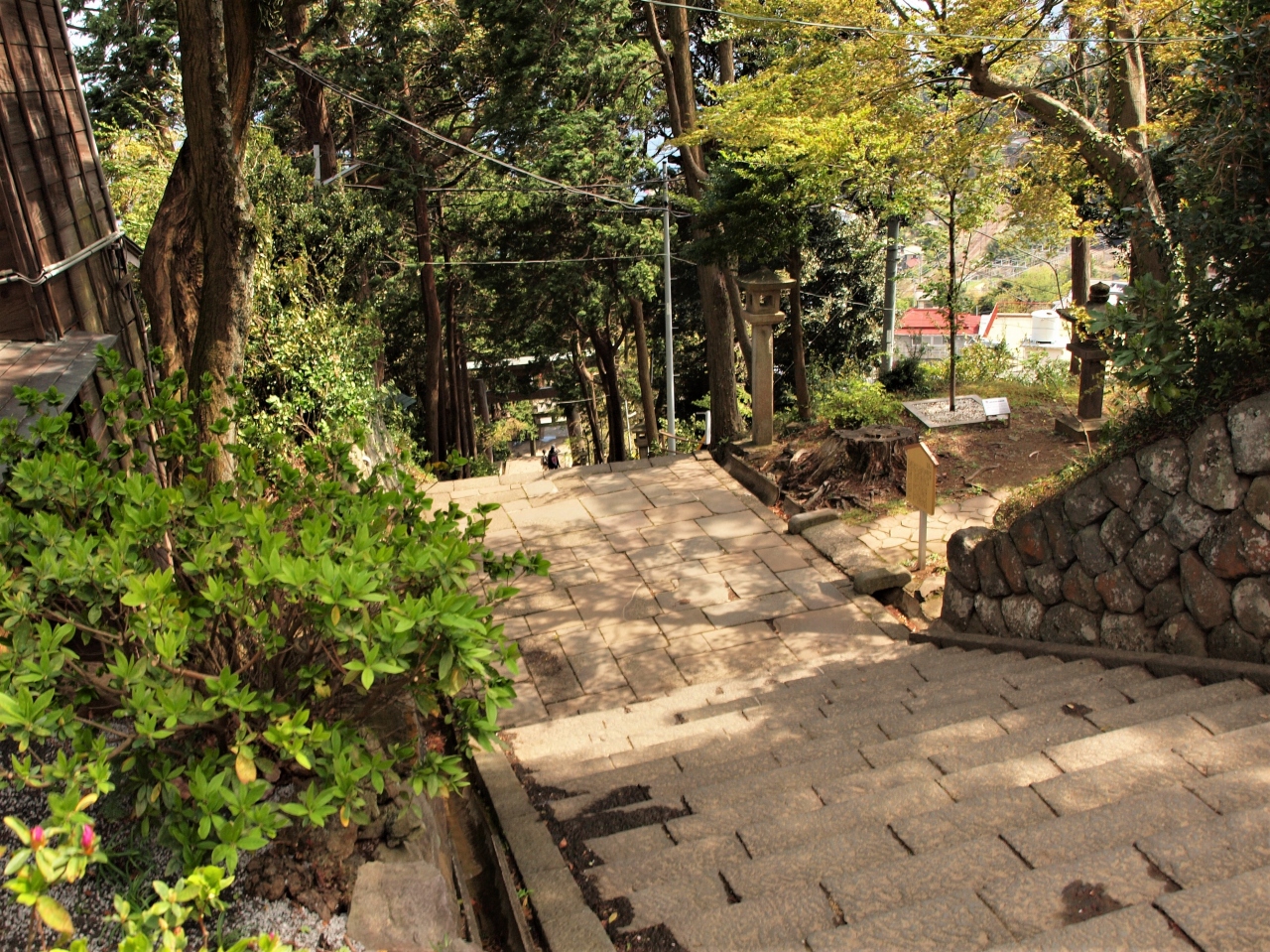 車で境内まで行くことが出来るのですが、正面の階段を登って行くとすると、海岸の伊豆浜から神社の本殿前までは837段あるそうです!!
