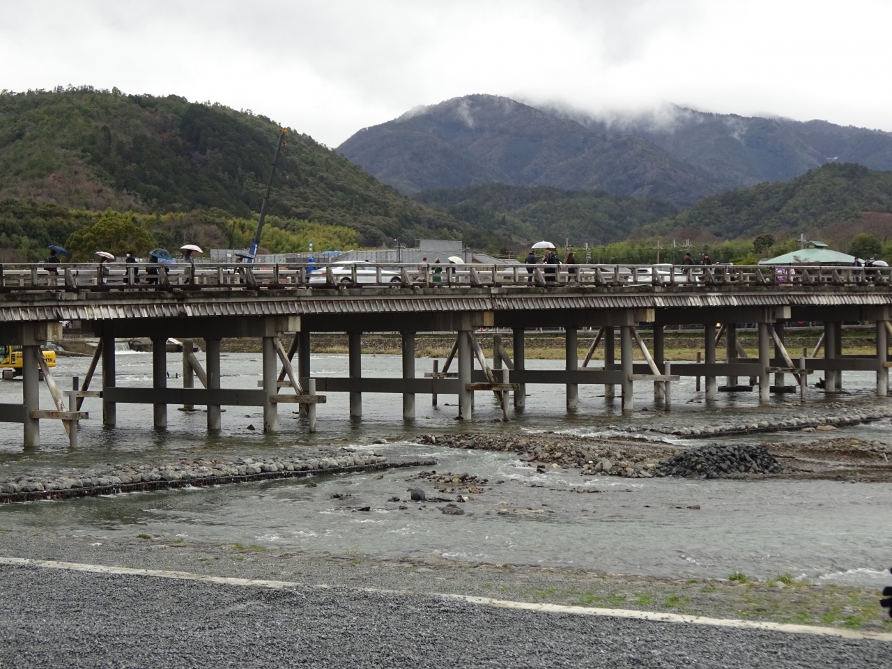 嵐山の代表的な観光地渡月橋。訪れたのは〇十年以上前の修学旅行以来で楽しみにしていましたが、橋の周りには幾つかの重機が置かれ興ざめな感じ。2013年の台風による桂川氾濫の影響がまだ残っているようでこれは仕方ありません。