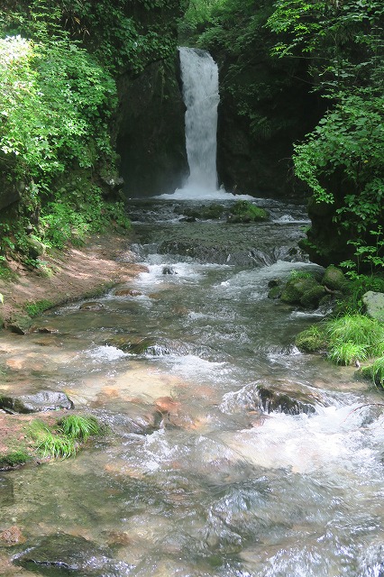 爽やかな川沿いを気持ちよく散策していくと見えてくる小さな滝。竜返しという程の迫力はないけれど、周りの木々の緑の中に白い滝が美しく映えている。近くに白糸の滝があり、そちらには観光客が多いがこちらはゆっくりと楽しめます。
