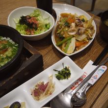 石焼チャーハン(通常の2/3の量)、メインのおかず、スープ、本日のサラダ、副菜2品、香の物、杏仁豆腐から成る。