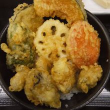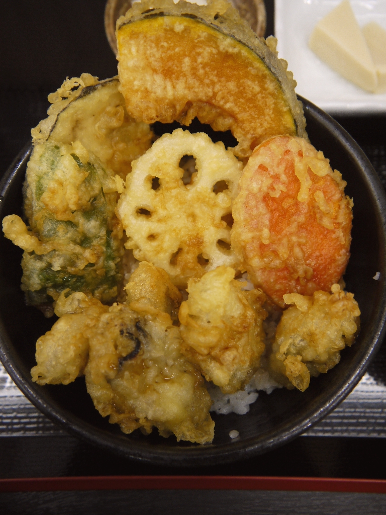 かき天丼には、かき、蓮根、ニンジン、カボチャ、ピーマン、サツマイモの天ぷらが、ご飯の上に盛られている。