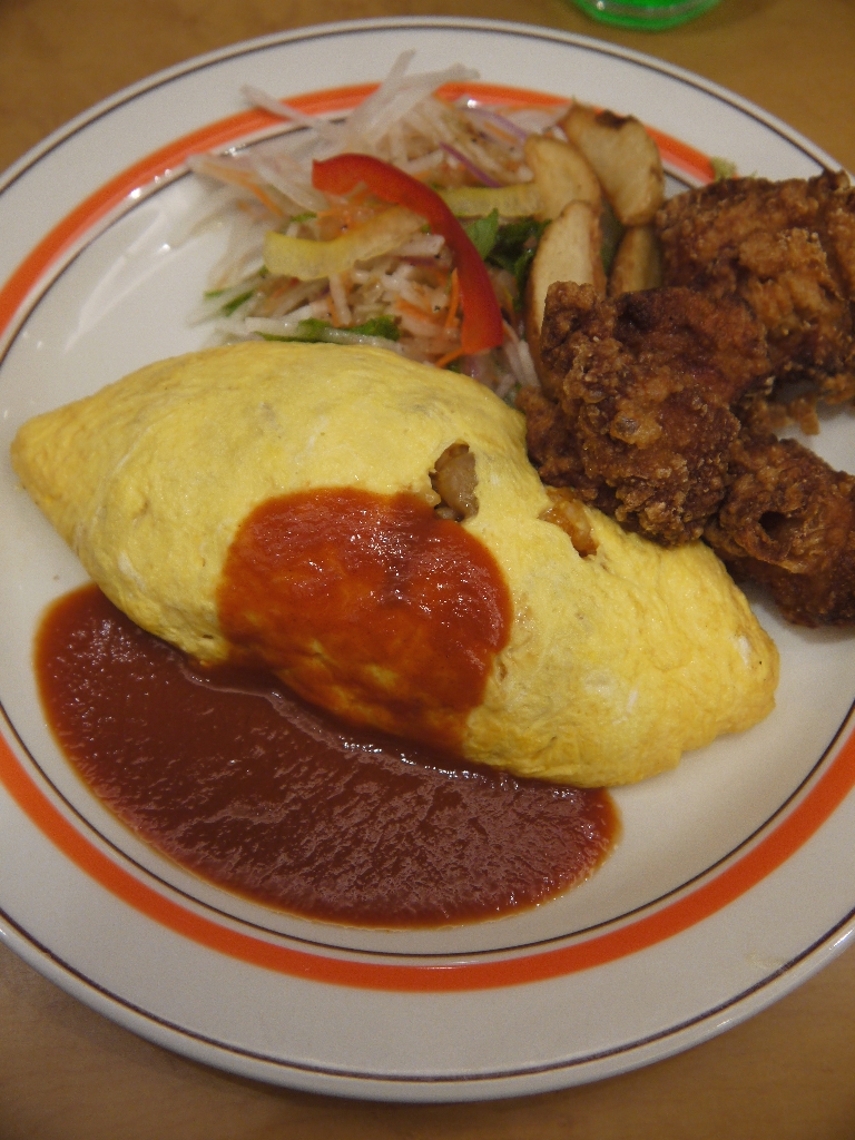 レギュラーのオムライスに、唐揚げ、フライドポテト、そしてサラダ(大根がメイン)が盛られている。