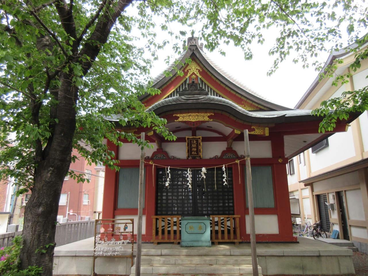 小松橋通りに面しています。浅草警察署と富士小学校の交差点にあります。この辺りは平地ですが、浅草富士浅間神社の境内だけ小高くなっています。富士山への信仰に基づいて建立し、神仏分離以前は浅草寺が管理していました。現在は浅草神社が管理しています。境内に五合目からの富士塚があります。富士塚の真ん中にある磨かれた石の球は子授かり石です。コンクリート造りの社殿は白壁にえんじの柱です。訪れた平日午前に参拝する人がいました。小松橋通りの歩道から深く拝礼している人もいました。篤く信仰されています。境内は狭いですが、低い富士塚や子授かり石を見に訪れてはいかがでしょうか。