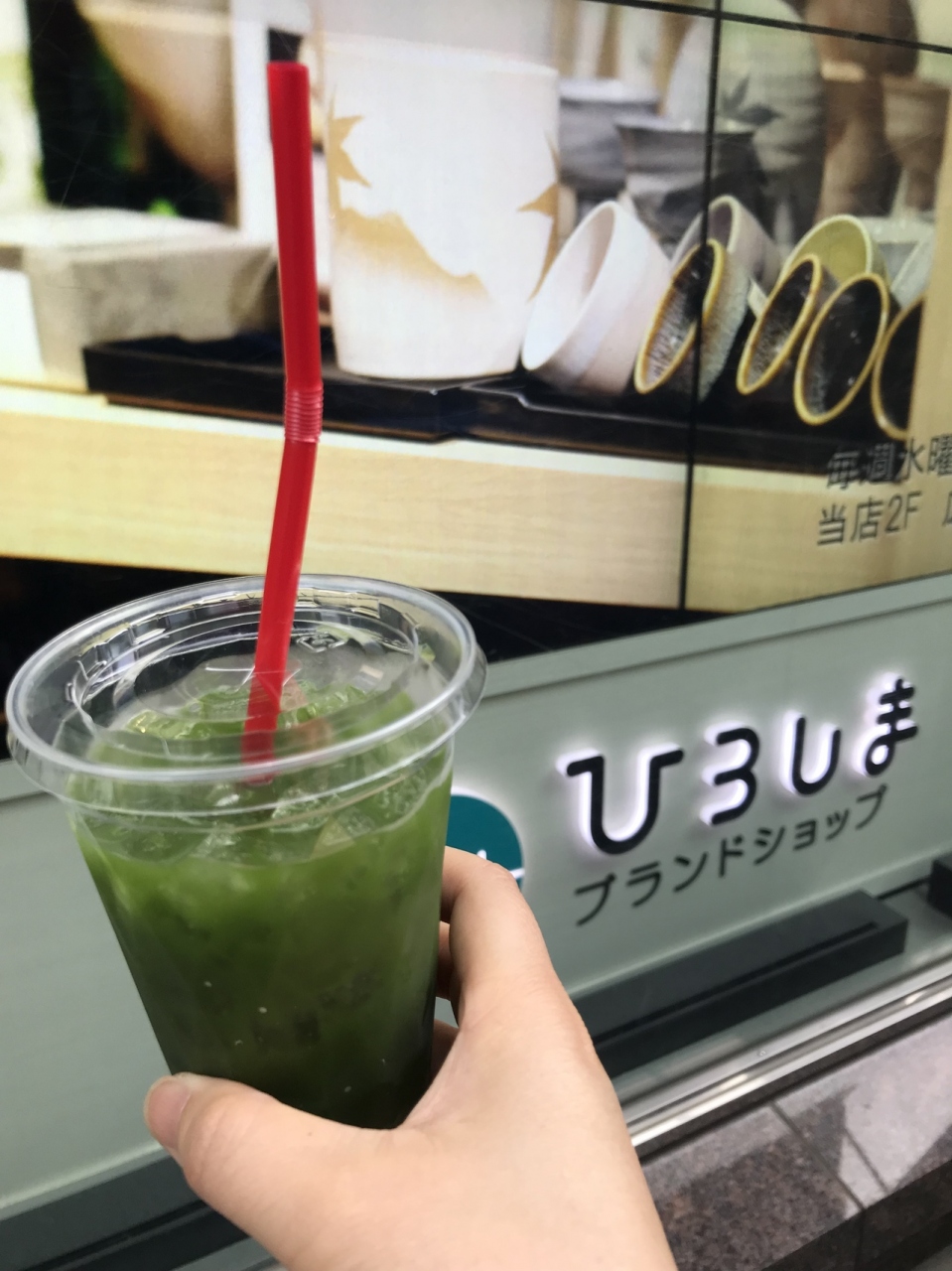 銀座にある、広島のアンテナショップです。一階は広島のご当地調味料やお菓子や食材が買えるほか、一角で汁なし坦々麺とジェラートやドリンクが買えるお店があります。グリーンティー150円は甘く味がついています。