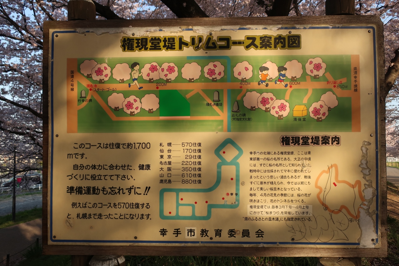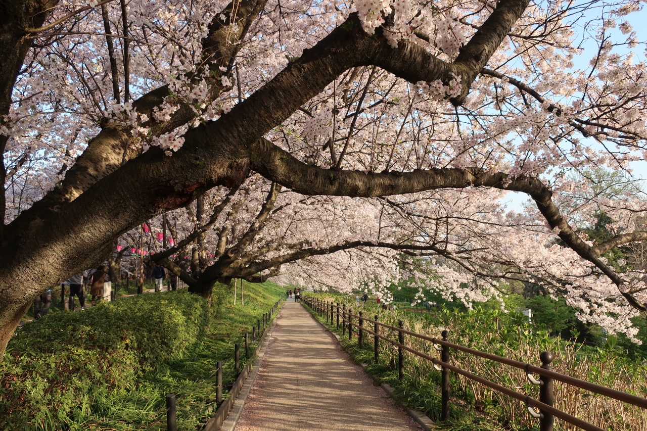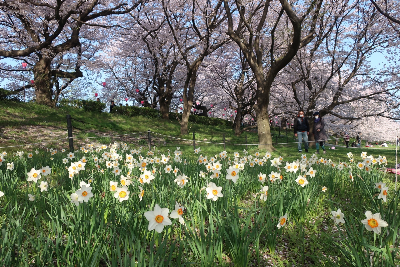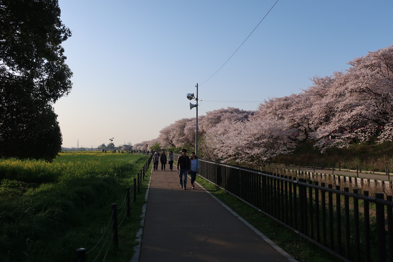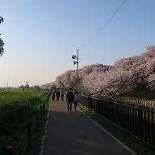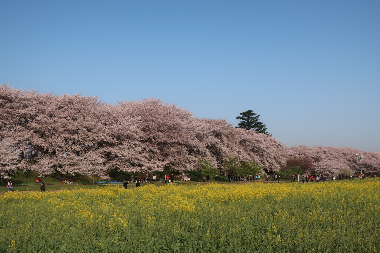 幸手市の中川沿いの堰堤に設けられた公園です。桜、紫陽花、曼殊沙華、水仙等、四季を通して花々を楽しめる広い公園ですが、何を言っても一番の見頃は堤に植えられた桜並木と河川敷の菜の花が咲き誇る春です。周辺一帯は渋滞し、人だらけとなりますが、青い空、ピンクの桜の花、黄色い菜の花のコントラストが見事です。今年は菜の花の開花が桜の花より遅れ5分咲きでしたが、それでも感動する景色がみられました。