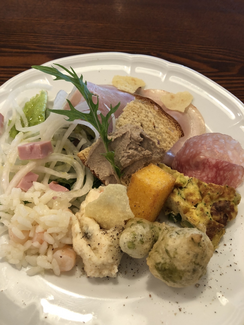 パスタセットをオーダー。前菜はいろいろバラエティーにとんでいていい感じでした。パスタは型押しの珍しいパスタでした。