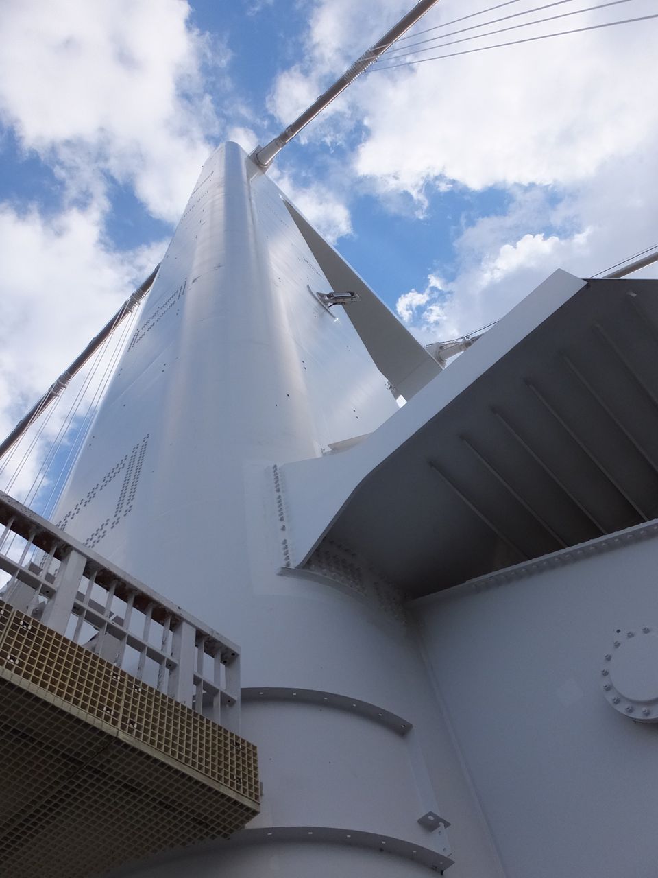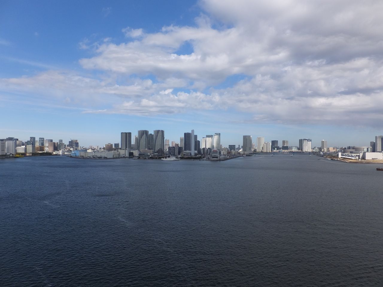 実は歩いて渡ることができます。ただアクセスがいまいちで、田町駅から20分くらい歩きます。また出口側のお台場の方もお台場海浜公園駅まで10分くらいかかります。橋を渡る時間の20分とエレベータ等の5分を併せると1時間以上かかるので注意が必要です。さすがに眺めがよく都心方向は河口と、その向こうのビル群、海側は東京湾がきれいに見えます。ただ、海側と陸側の通路の乗り移りはできないの登る時点で決めておかねばなりません。もちろん往復歩けばいいだけのことではあるのですが。