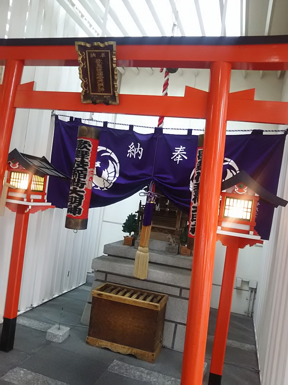 都営線と日比谷線の東銀座を出て歌舞伎座のところから上に上がると歌舞伎座の入り口を越えて左でにこちらの稲荷大明神があります 小さいながらもとても綺麗に手入れがされており、いつも観光客が写真などを取って記念撮影をしている場所です