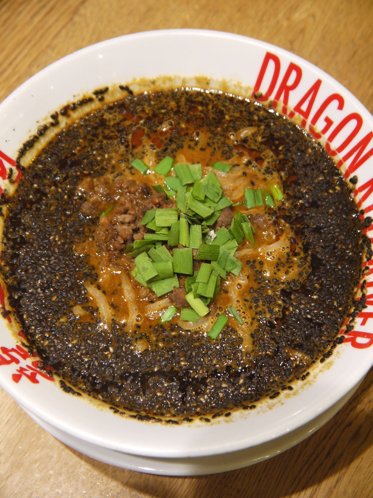 濃厚なスープに、黒胡麻がたっぷり掛かっていて、スープが黒く見える。他に、牛挽肉と、ネギもトッピング。これぞタンタン麺、といった感じ(汁有りタンタン麺をイメージしている場合)。無論、辛さもそれなりにある(店の基準では、辛さは少な目らしいが)。