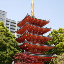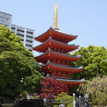 東長寺の本堂の左側に、鮮やかな朱色の五重塔があります。五重塔は、平成23年に完成したばかりなのでまだとても色鮮やかで、両隣の大きな木に挟まれるような形で、青空にも映え、とても綺麗でした。多くの人が写真を撮っていました。大仏様以外は、無料で見学出来ました。