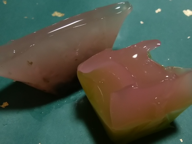 あけてみると、どちらも、ふるるん~としたゆる~い感じのお菓子が登場。菓遊心は、桜色の下のほうに、小豆の粒が見えます。うん、桜が香ります。