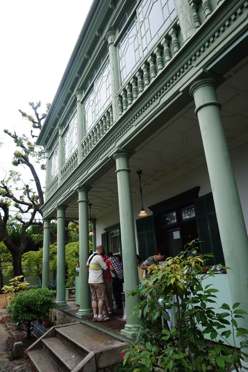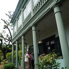 長崎の西洋人住宅でも見られるような、広いテラスと緑色の柱・壁が印象的です。