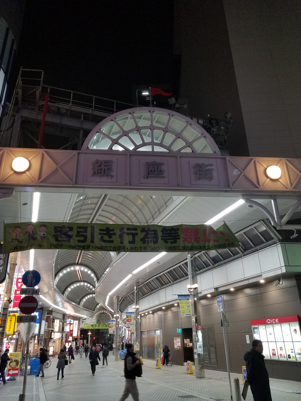 川崎銀座街は、京急川崎駅を南側に出てすぐのところにあるアーケード商店街です。高い天井が開放的ですが、大通りまでの1ブロックだけで規模は小さく、大通りの先には「銀柳街」が続いています。飲食店が中心なので、京急川崎駅利用のときにの食事で時々利用しています。