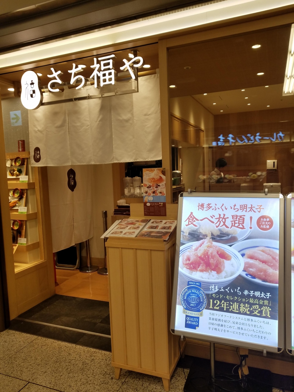 さち福やは、JR川崎駅東口の地下街「アゼリア」のレストランエリア「グルメッセ」内にあります。店頭に並ぶ沢山の定食メニューサンプルに惹かれて入った店内は、お洒落で綺麗、女性客がメインでした。ボリューム控えめでバランスを考えた定食を美味しくいただきました。明太子食べ放題ですが、実際にはそんなに食べられるものではないですね。
