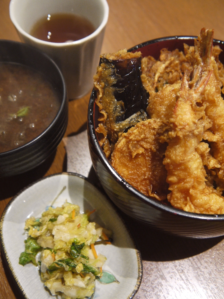 丼にご飯を敷き詰め、その上に、ダシに潜らせた天ぷらを山盛りトッピングしている。