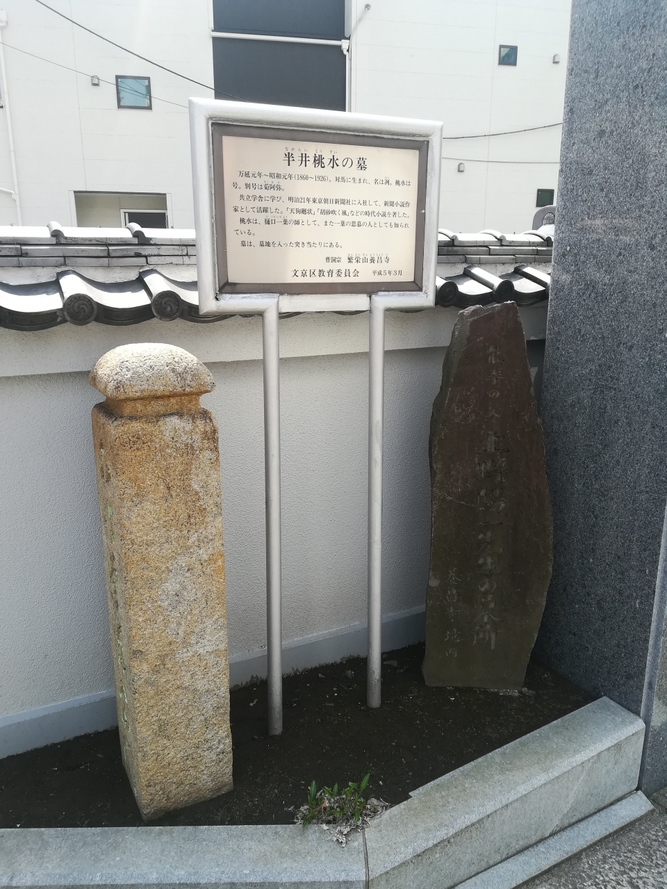 本駒込駅の駒込側(北側)の西側にある曹洞宗の古刹です。江戸時代の創建で湯島を経てこちらに移られたそうです。少し奥まったところに本堂があり、墓地には明治から大正にかけて活躍し、樋口一葉の師であった半井桃水のお墓がありました。