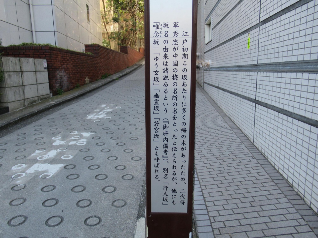 別名「行人坂」「唯念 (ゆうねん) 坂」「ゆう玄坂」「幽霊坂」「若宮坂」とも呼ばれる。
