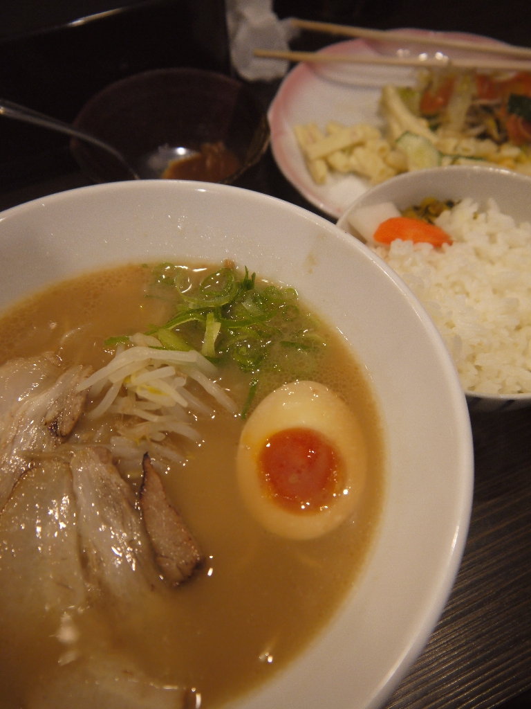 ランチタイムは塩ラーメンと豚骨醤油ラーメンの二種類を提供。ご飯等が付いたセットメニューもある。
