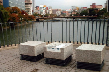 橋の中ほどに座る場所があり、ゆっくりと流れを眺めることができる。、