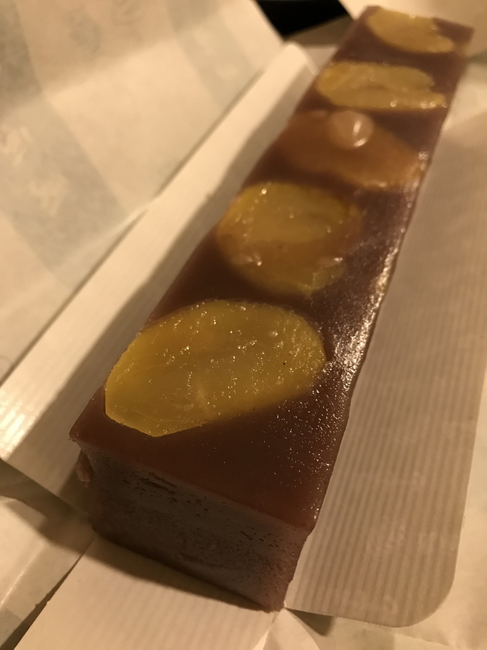生ういろうなるものを始めて頂きました!いつものういろうよりも、もちもち感が増します。おもちみたいでおいしー!一本500円前後でボリュームもあり、お土産に最適。日持ちは翌日までです。春は桜ういろうもありましたが、始めてなので1番人気の栗にしました。