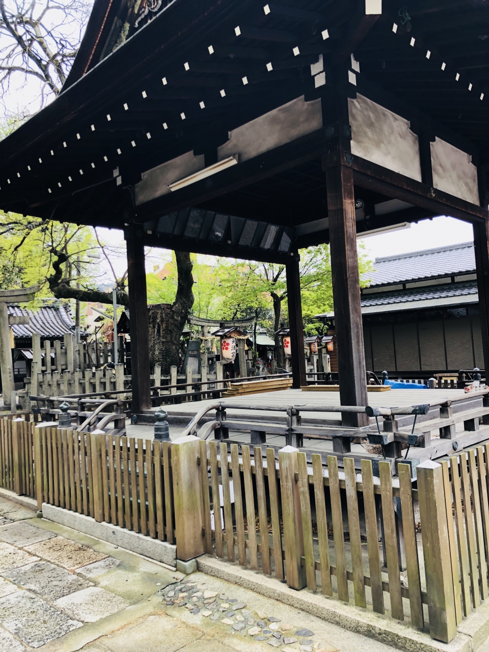 東山三条の交差点から三条通りより一本南の道を西に進むと、前方に大きな銀杏の木が見えてくる。いつものように三条通りを通っていると気づかなかった世界がそこにあった。近づくと大将軍神社の標柱が建つ。手入れが行き届いていず痛みが目につくが、能舞台もある立派な神社がそこにあった