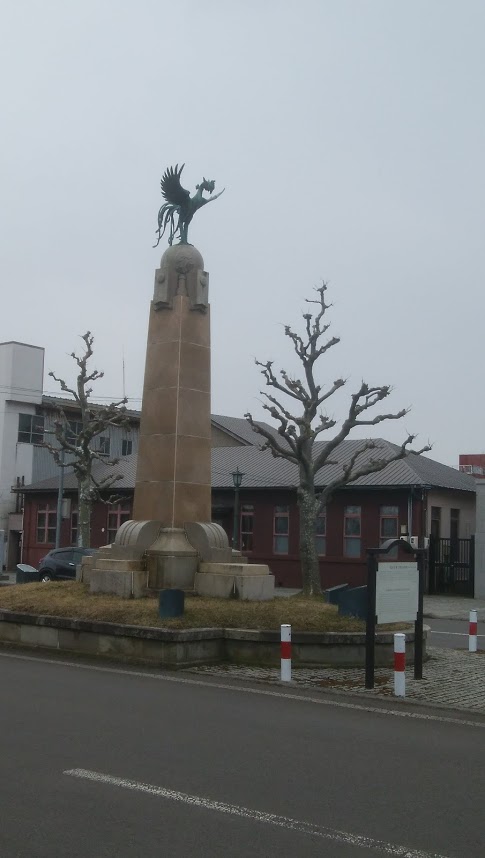 函館の元町エリアを散策したときに海上自衛隊函館基地の前に、箱館運上所跡地碑を見たあと基坂を移動しているときにこちらに立ち寄りました。大きな通り基坂通りの中央分離帯というかグリーンベルトの植栽の所にこちらの記念碑が立っています。近づくとかなり巨大で圧倒的な迫力を感じる記念碑です。記念碑の最上部に鳳凰鳥があってその大きさもかなりのもので、羽を広げた鳳凰が今にも飛び立つ感じです。海の近くで一体となった風景は壮観です。