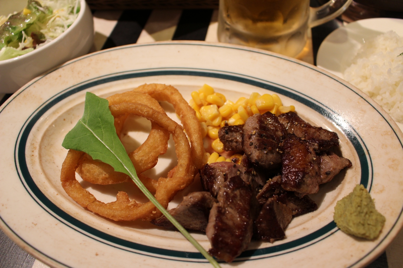 サービスステーキ(@980円+税)サラダ・ライス付は、お肉は若干固めのようでしたがまぁ満足だったようで・・
