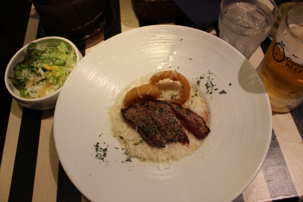 チーズリゾットステーキ(@1,000円+税)サラダ付はお味が薄めでもあっさりと感じ、テーブルに備え付けられた岩塩を好みで足しました。
