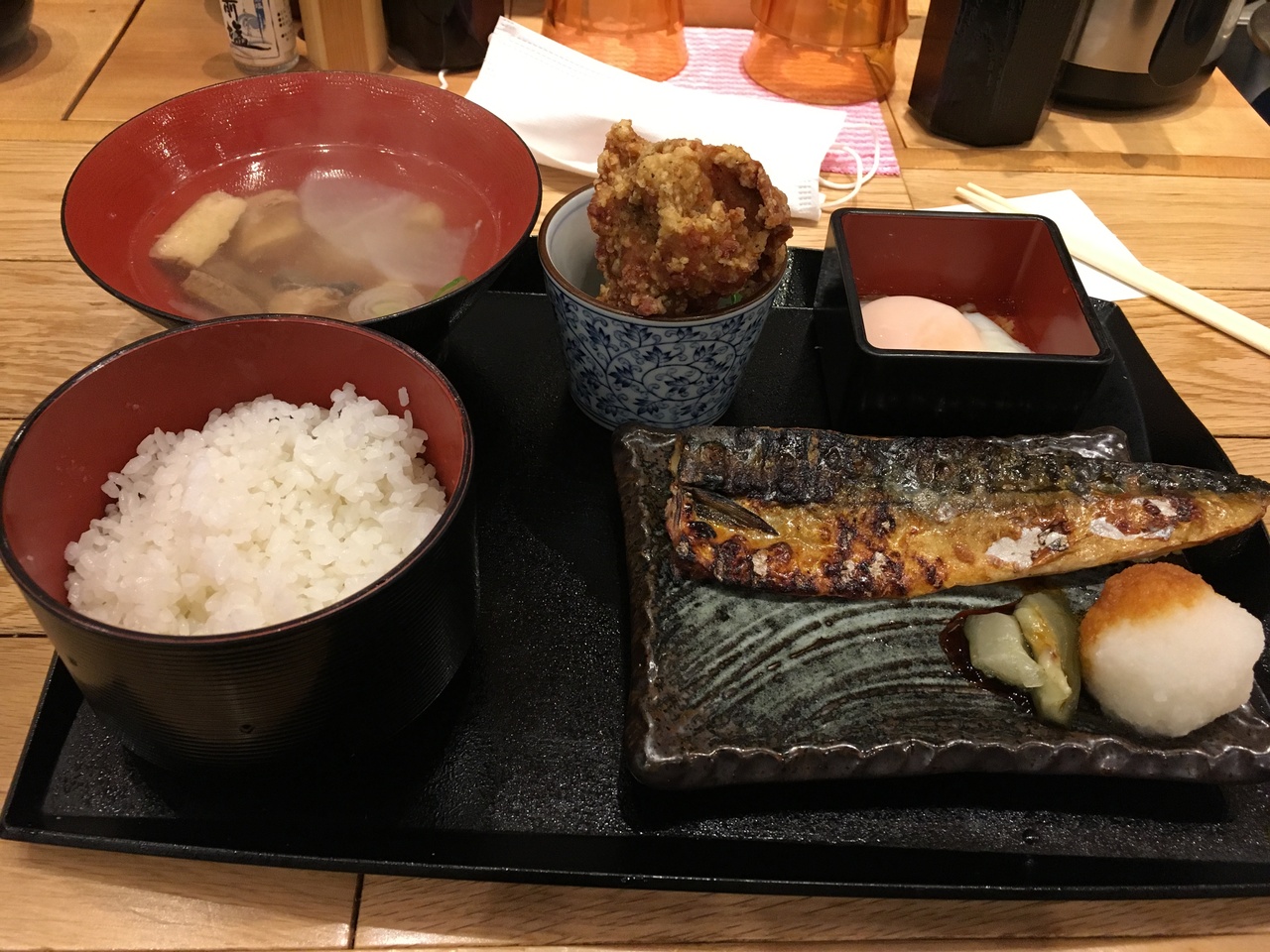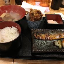 ランチに塩サバ定食選びました。おばんざいはとり唐揚げ、ひじき煮、茄子揚浸し、温泉タマゴ、おから卯の花、メンチカツの中からとり唐揚げと温泉タマゴを選びました。鯖はあぶらがのってて、とり唐揚げはジューシーで美味しかったです。