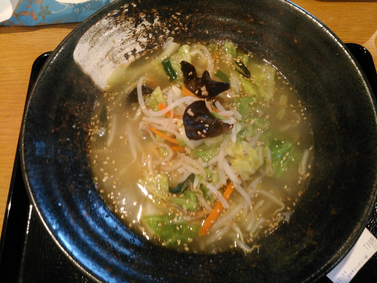 看板メニューは辛味噌のようです。味噌ラーメンは平麺(ちぢれ麺)も選べます。今回は、タンメンにしてみました。野菜多目でごまが良い感じです。並の盛りはさらっと食べられる量です。