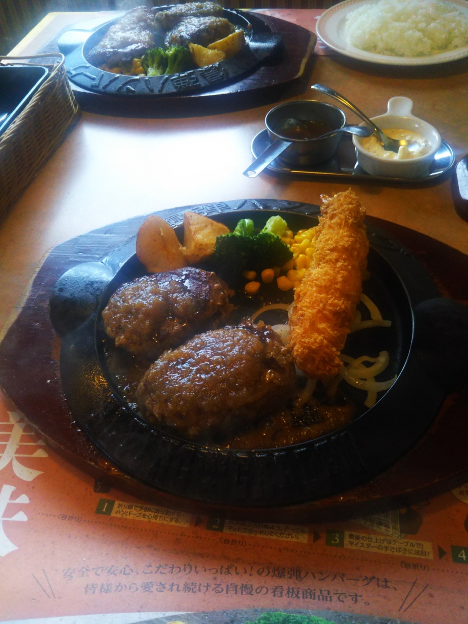 所沢の国道沿いにあるハンバーグレストランです。お昼時にはランチメニューがあり、お得にいただけます。爆弾ハンバーグはアツアツの鉄板にのってきたハンバーグを店員さんが切ってソースをかけてくれます。この時、ジューと油やソースがはねるので注意が必要。牛肉の肉肉しさがたまらないハンバーグでした