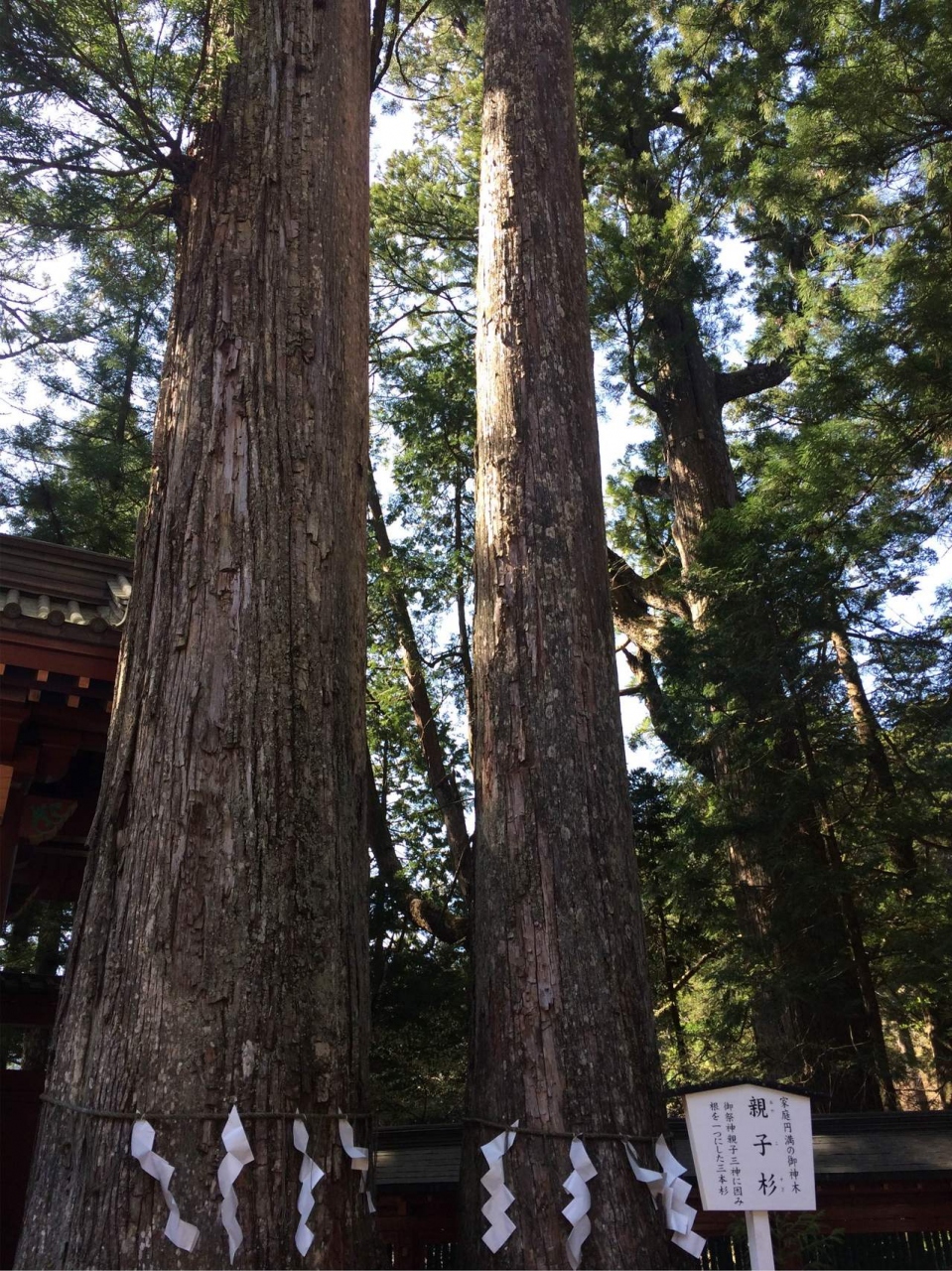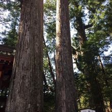 神木といわれています。日光二荒山神社の鳥居をくぐって左側に2本立っています。根っこがくっついていて見上げても一番上が見えない高さです。近くで木の工事をしている方に聞いたら「刀持ってやいやいやってた時代から生えてるよ」と教えてくれました。