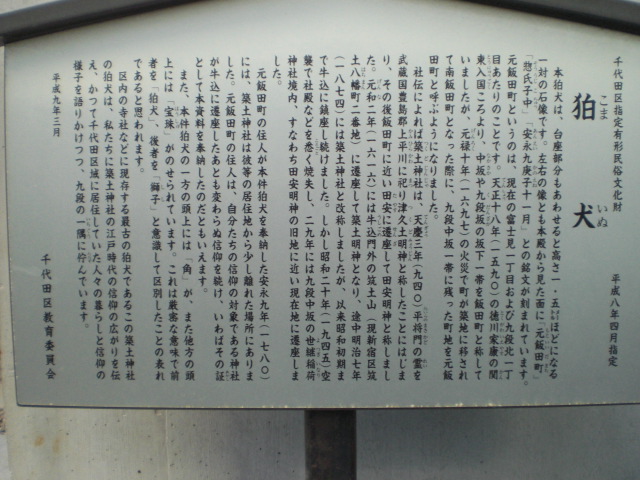 狛犬は、千代田区内に現存する狛犬の中では、最も古く約240年前の狛犬で、平成8年に千代田区有形文化財に指定されています。