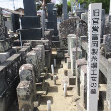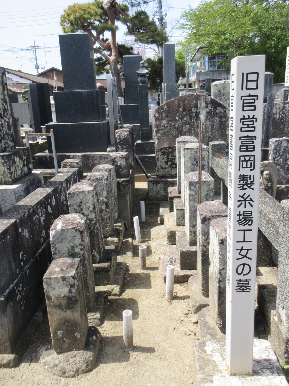 富岡製糸場近くの上町通りに面している龍光寺境内の墓地にあります。本堂の裏に広い墓地があります。墓地入口に富岡製糸場で働いていた人々の墓の場所と埋葬されている人の名前を記した案内板が立っています。官営時代や民営化した三井時代に亡くなった日本全国から来ていた工女たちと製糸場の役人が埋葬されています。龍光寺住職さんが詳しく教えてくれました。埋葬された工女は9才から40代までで、コレラが流行った明治12年に亡くなった方が多いそうです。そのうち約四割の方が滋賀県から来ていたそうです。墓石は小さく黄色い苔が生えていて名前が読めないものもありました。近代産業をになった若い工女の存在を忘れてはいけないと思いました。住職さんの話と説明板を読んで、将来も保護してもらいたい墓だと実感しました。富岡製糸場を見学された後、時間があったら寄ることをおすすめします。