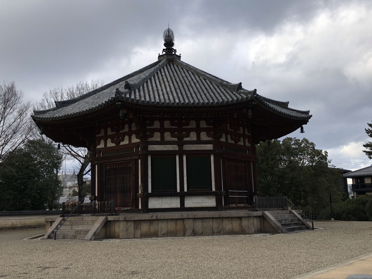 興福寺から駅に向かって歩く観光客はほとんどが南円堂に向かうので、こちらはひっそりとしている。こちらは国宝なので特別展以外では参拝できず柵で囲ってある。南円堂と違って彩色されておらず、渋い感じがする。その脇を進むと東向き商店街のど真ん中に出る。
