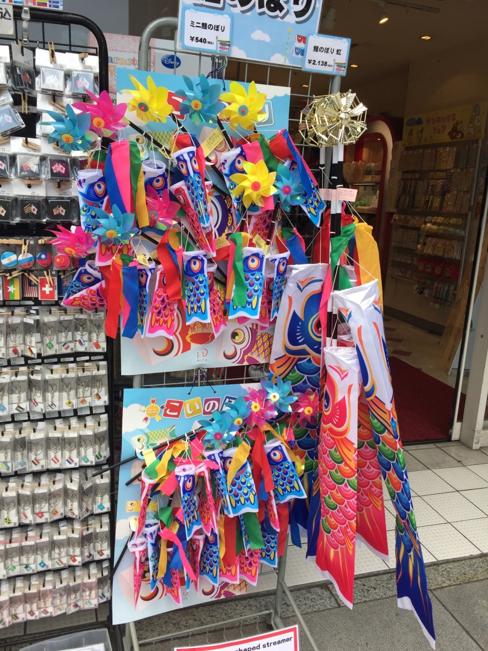 先日テレビのワイドショーで見た桜田淳子さんのライブで騒がれてた博品館ですね。季節柄可愛らしい昔ながらの鯉のぼりが店頭に並んでいました。東京オリンピックのキーホルダー、トートバッグ、Tシャツなどのグッズ がたくさん販売していました。