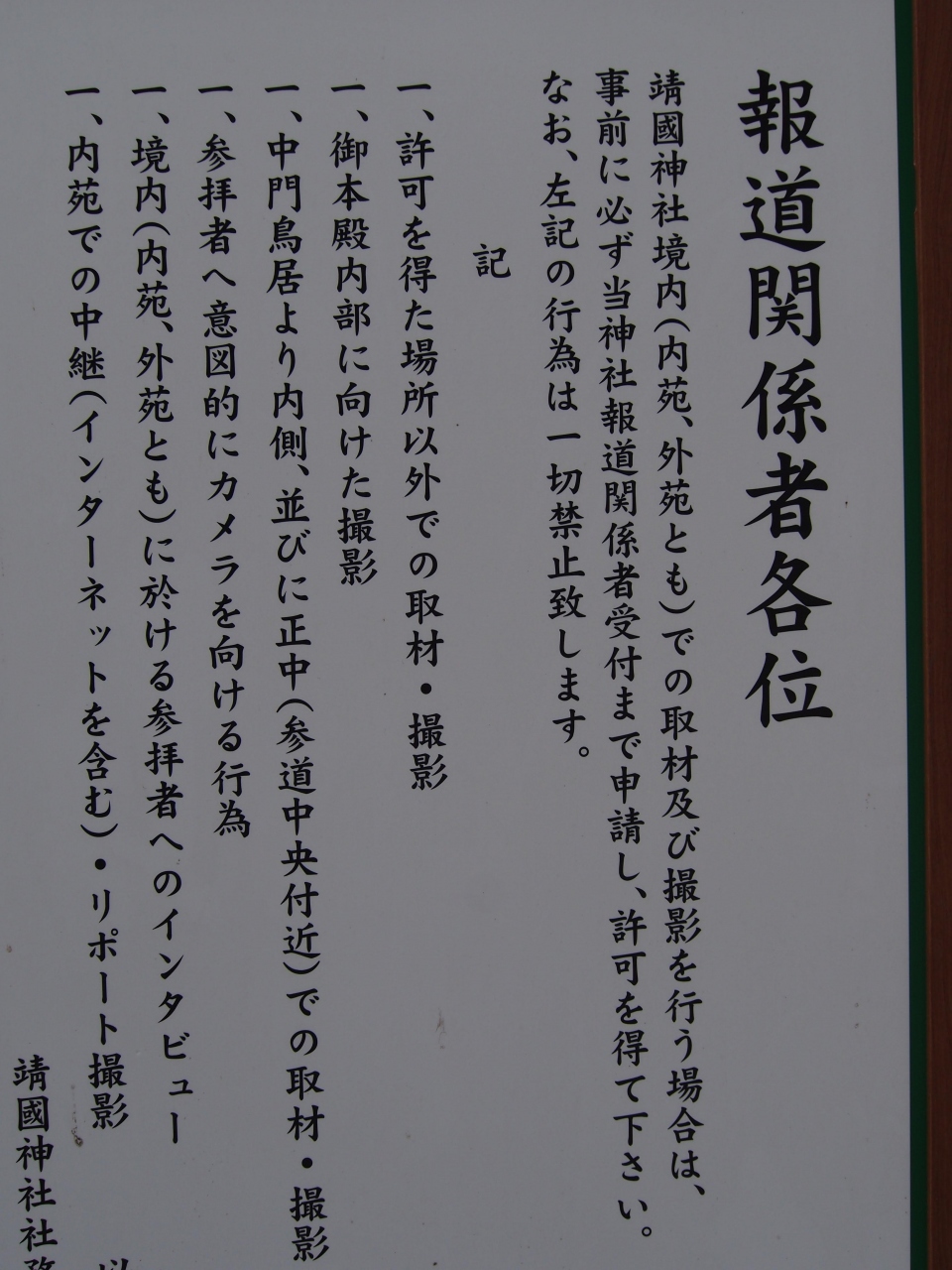 靖国神社は何度も足を運び、あちらこちら勝手に写真を撮っていましたが報道関係者に関しては結構厳しい決まりがあることを初めて知りました。