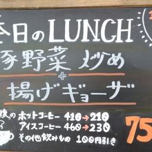 11:00-15:00ランチタイムがあります。豚野菜炒めと餃子のセットで750円です。味は普通です。量は十分にあります。食後のコーヒー、ホットは210円、アイスは230円です。そのほかのドリンクは100円引きになります。