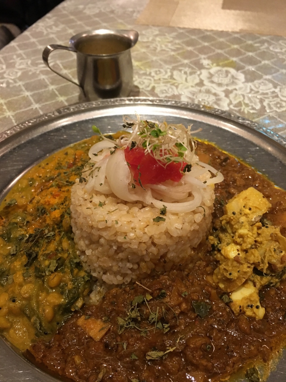 あいがけで、菜の花のカレーと牛豚キーマを選びました。これに小さなポットでスープのようなカレーが付いてきます。それぞれ単体で食べてもいいですが、全部混ぜて食べるとより美味しくなるので不思議です。