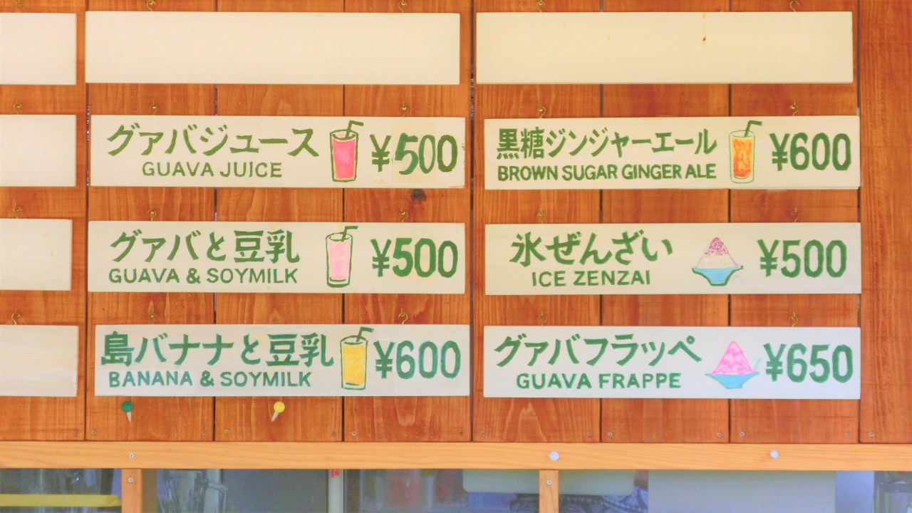 メニューはグァバジュース系、島バナナ&豆乳、黒糖ジンジャーエール、氷ぜんざいです。南国で飲むグァバジュースはホントおいしい。