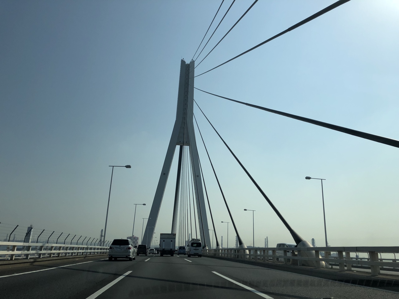 ベイブリッジは吊るためのワイヤーが両脇に並んでいるのに対して、つばさ橋は中央にしかないので、通過していても印象がだいぶ違います。